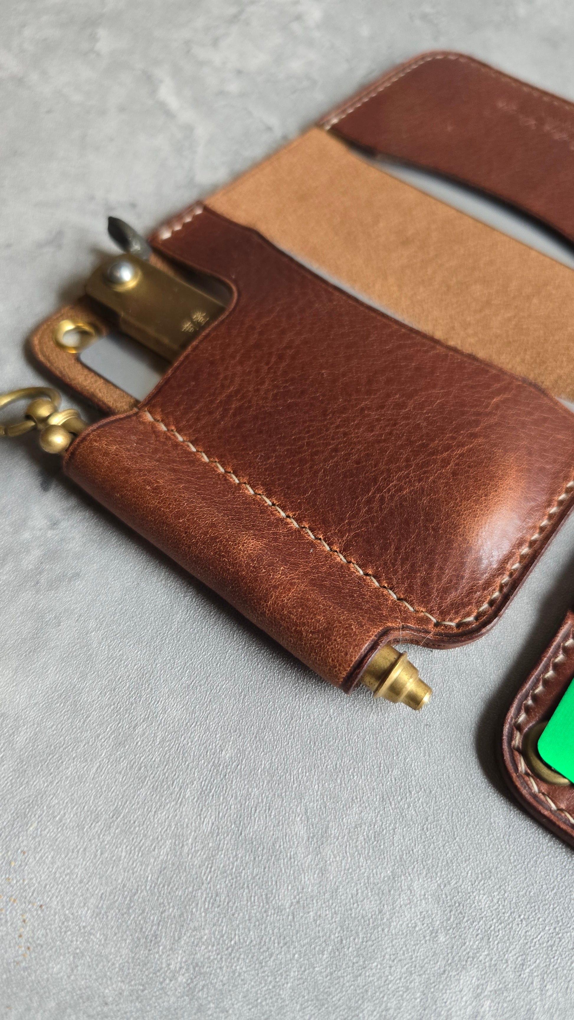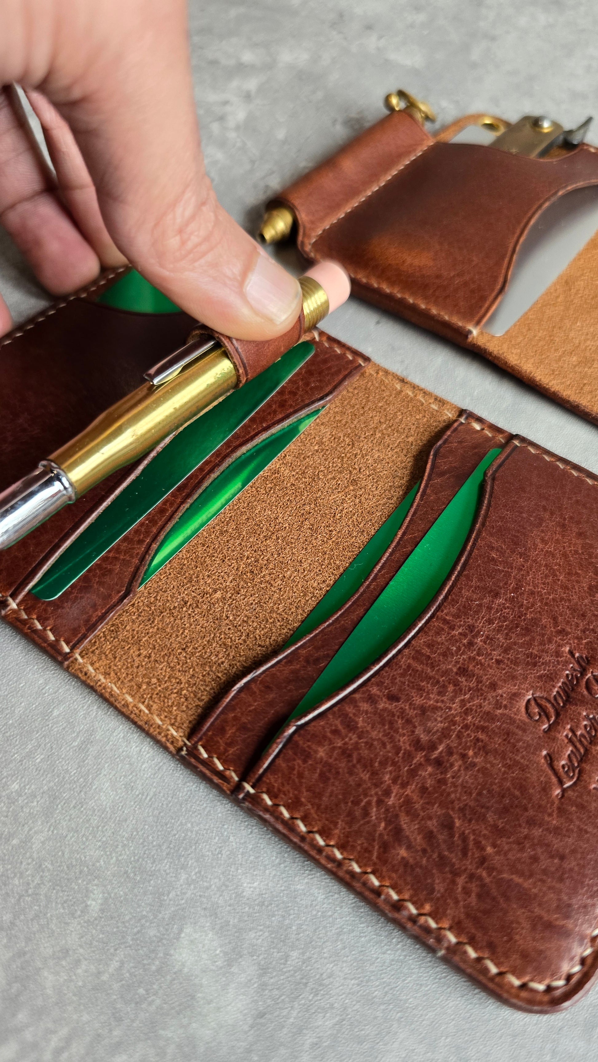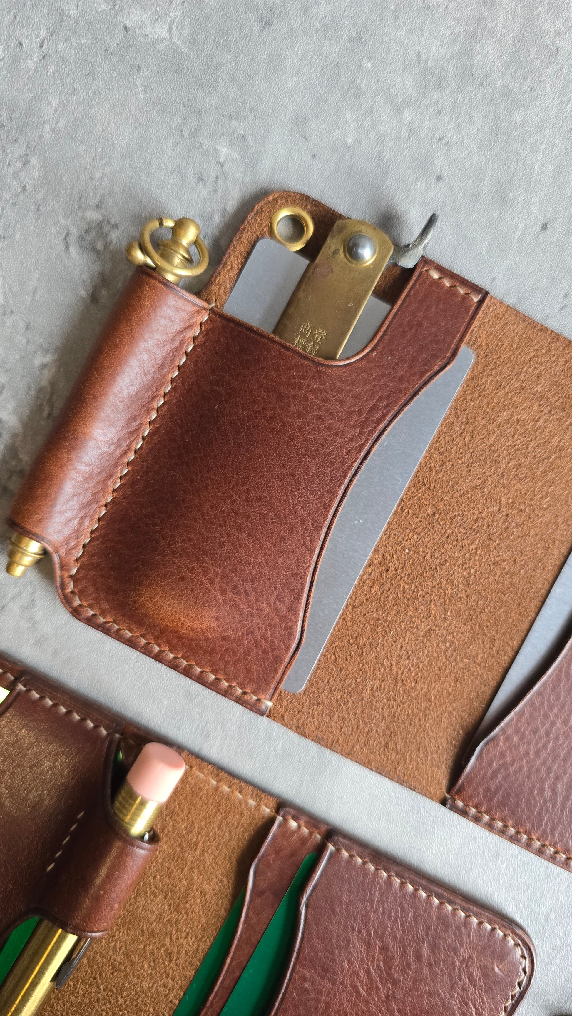 The theme is outdoors with lots of space for multi tools, pens, flashlight and more. Wallet A is larger and can take a large batch of cards. Wallet B is smaller and more stealthy.