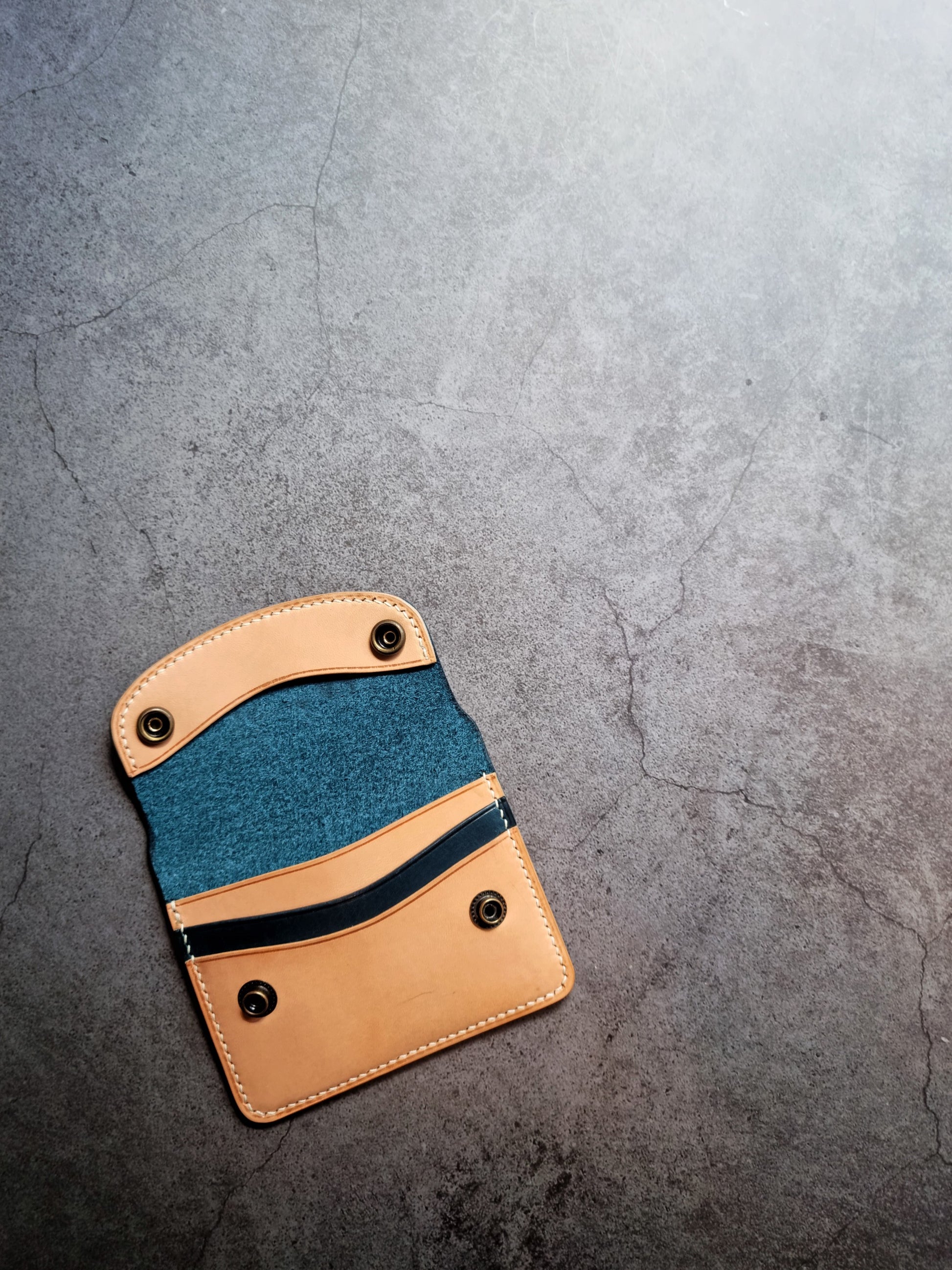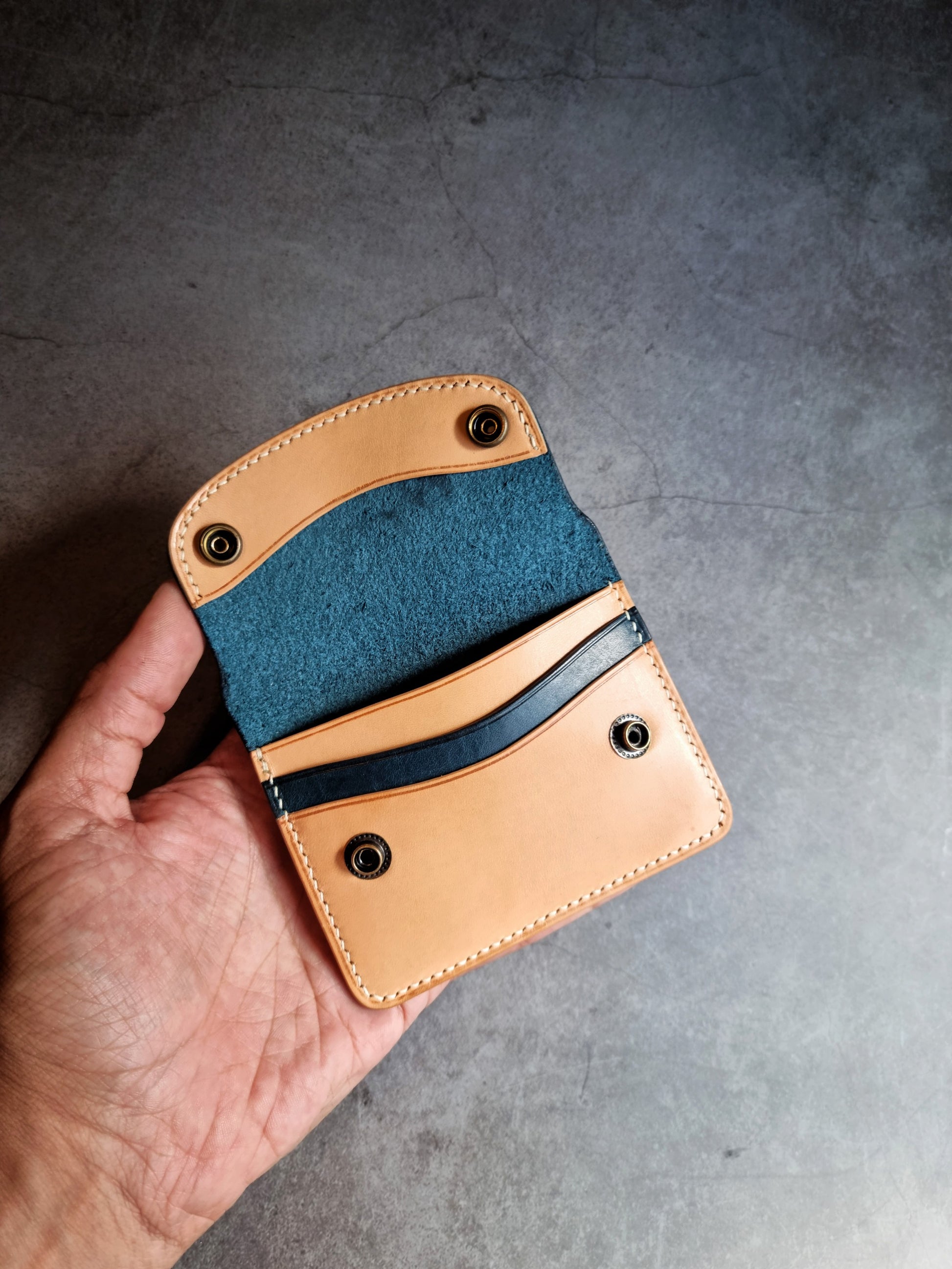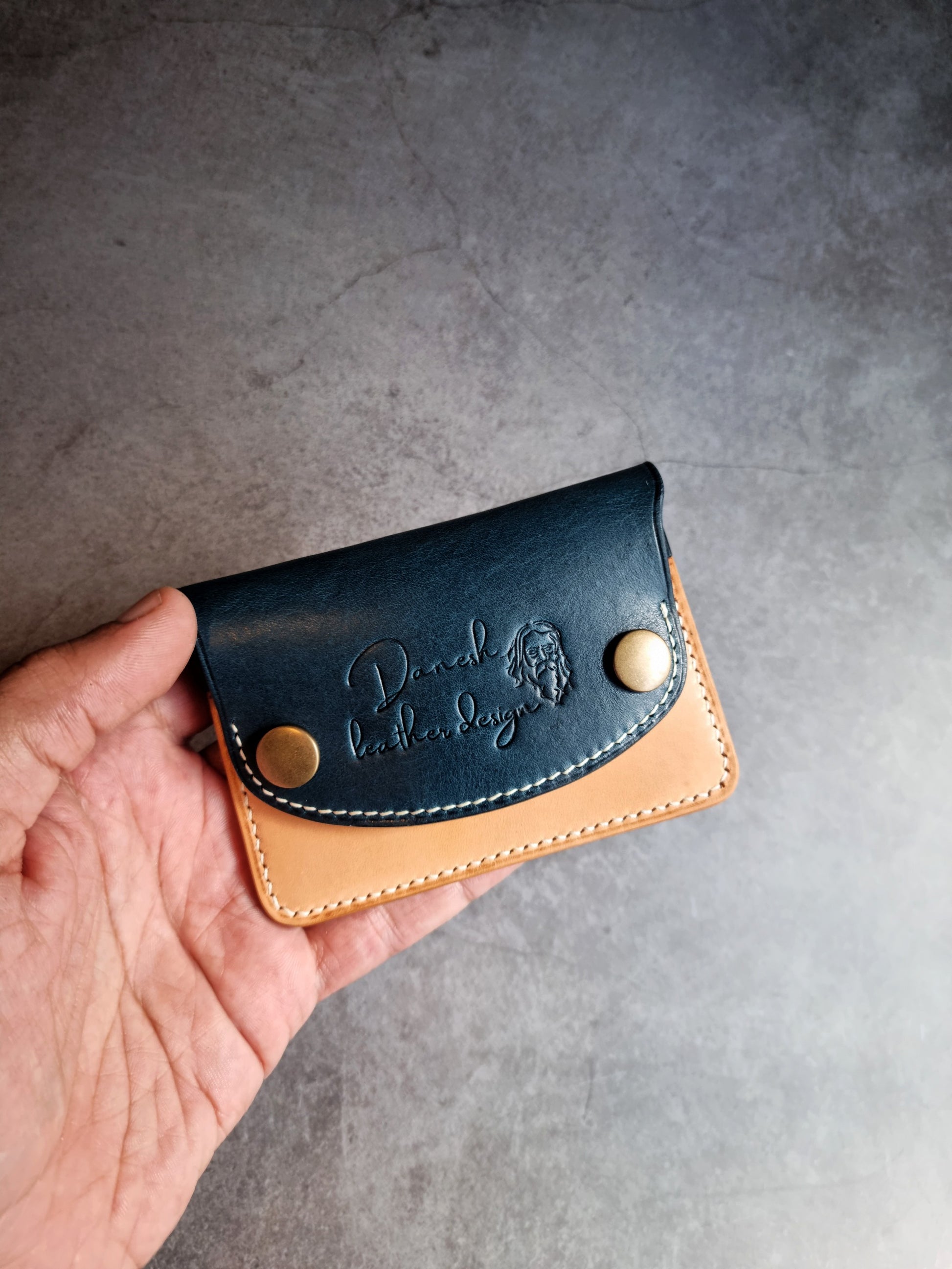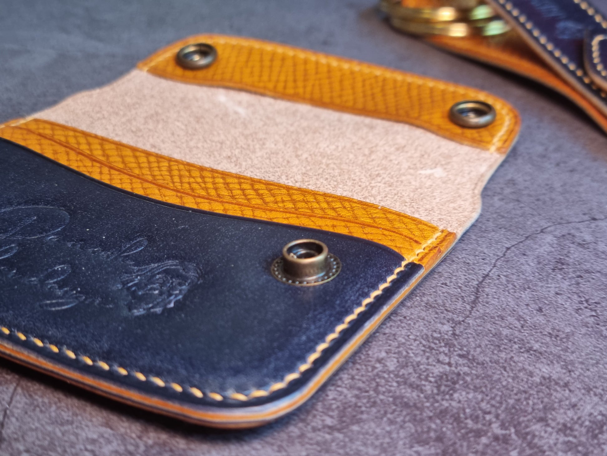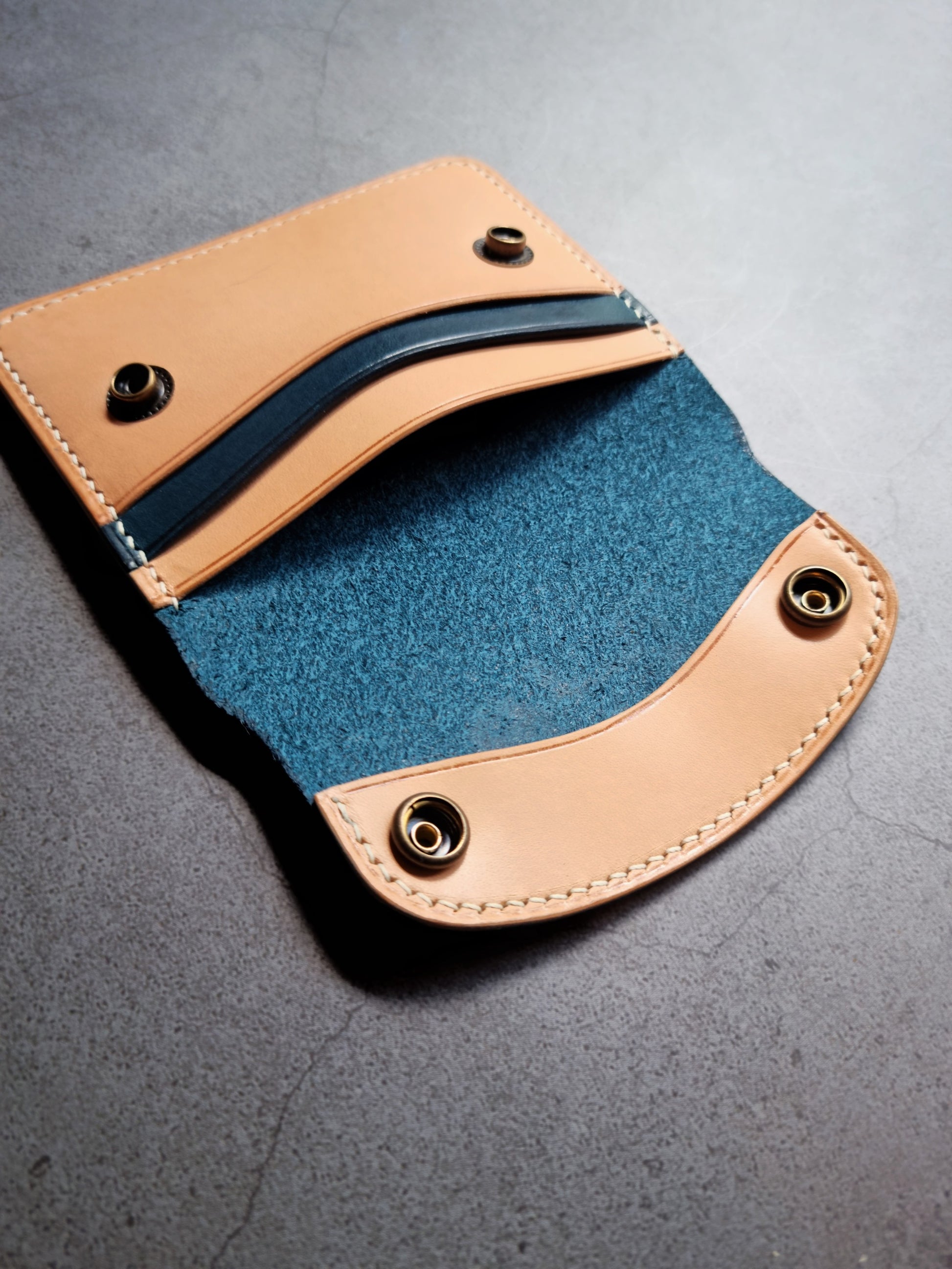 A horizontal flap wallet with double snaps featuring 4 pockets including a quick draw, card slots and a coin pocket with a catcher.