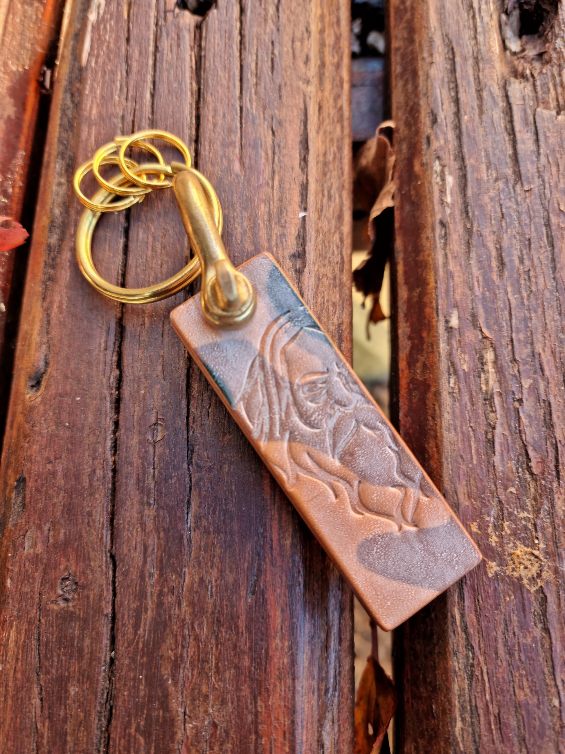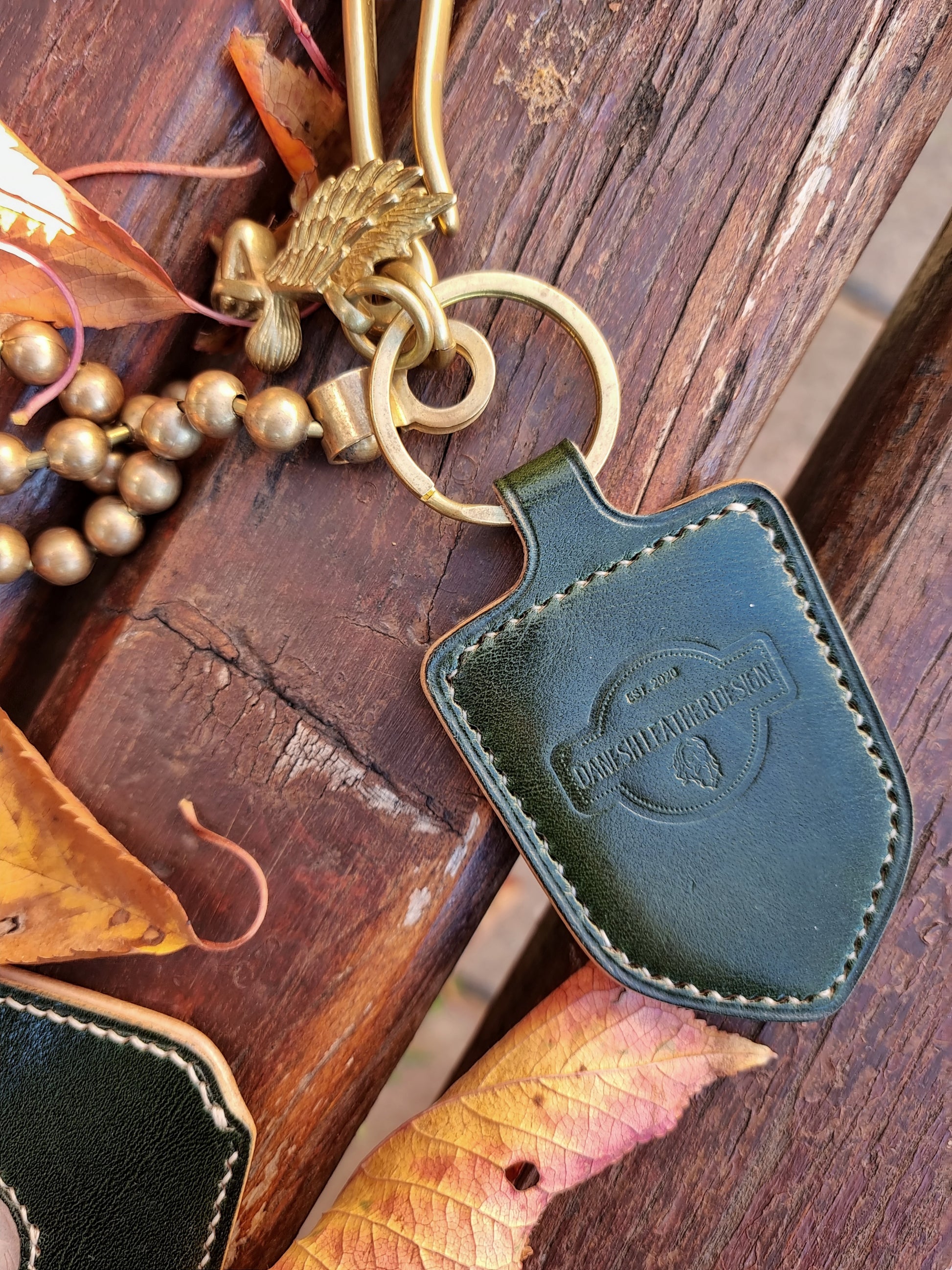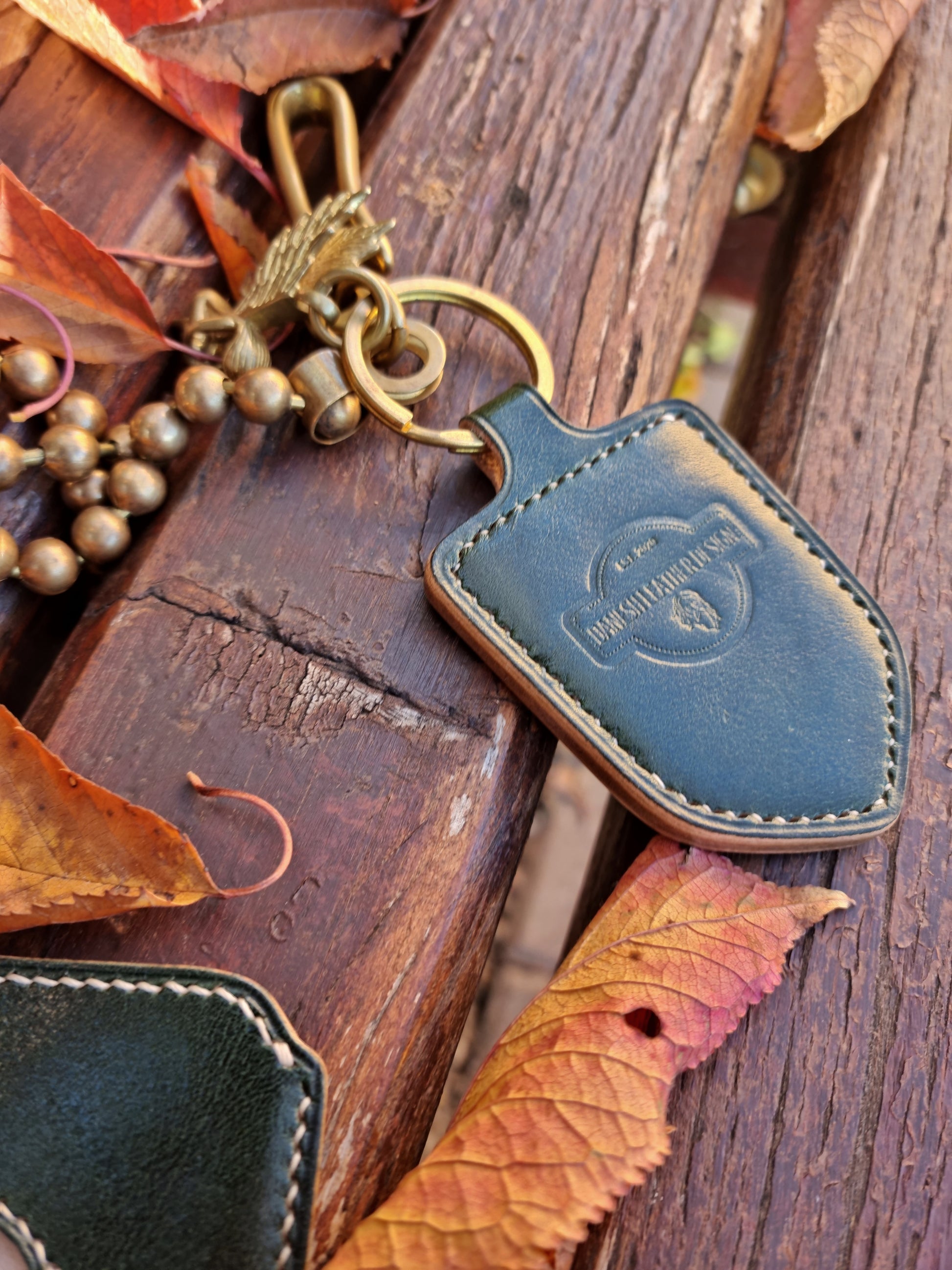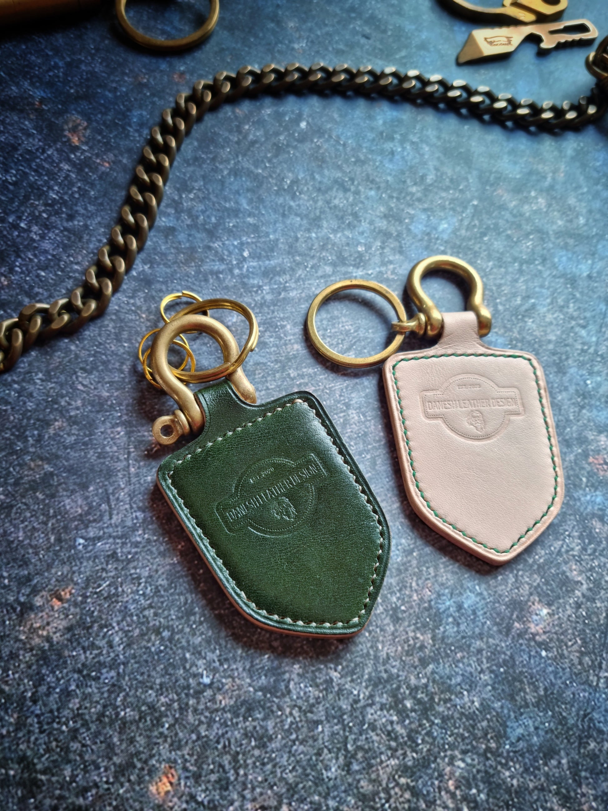 Key fob with horseshoe brass closure or a large split ring in different colour variations, features a heavy built and a logo on the front side.