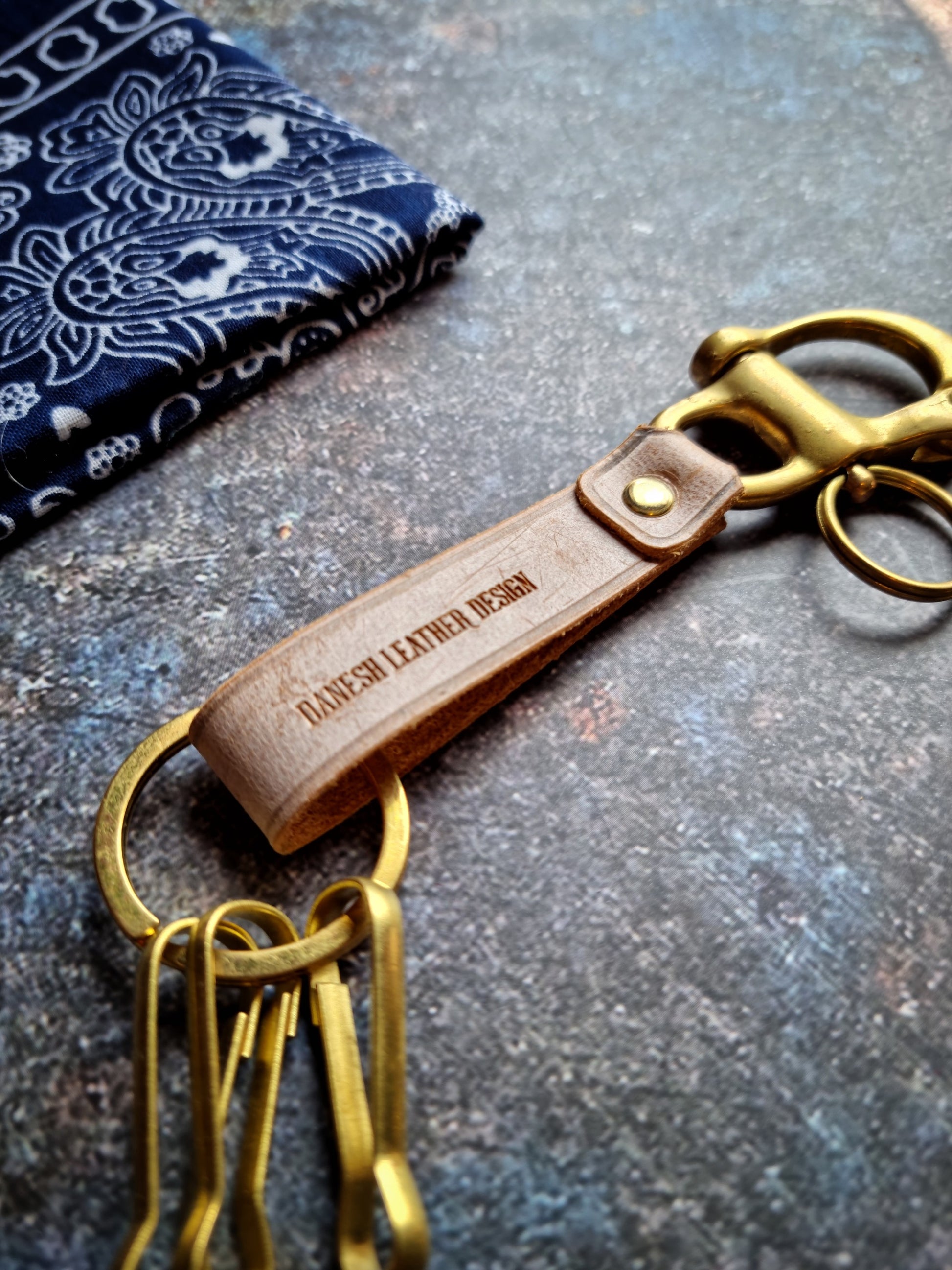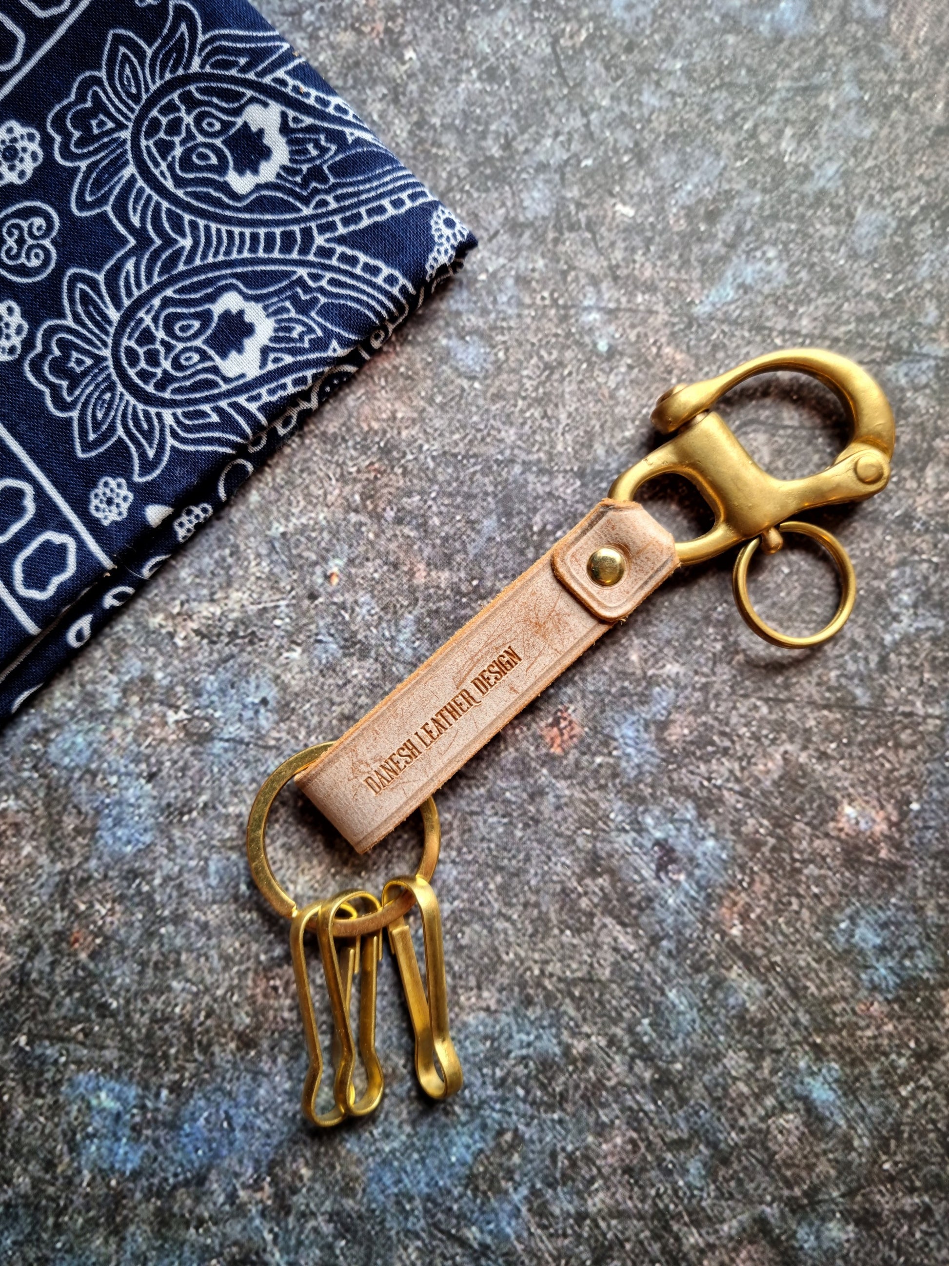 Handcrafted key fob from ghost leather in tan, features a naval buckle with emergency release pin, a split ring and 3 hooks all from solid brass.