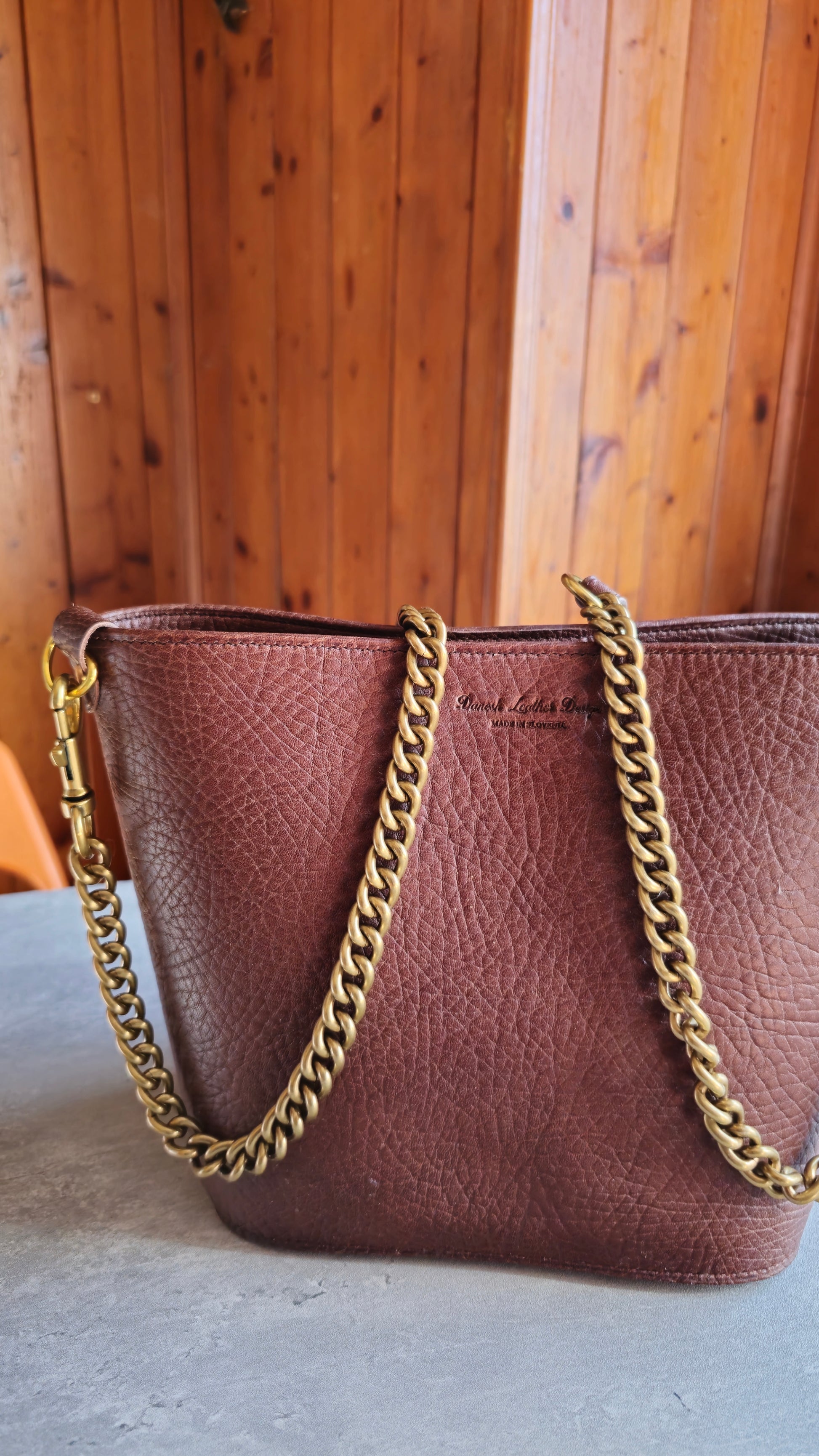 The Brunhilda bucket bag is a medium sized oval bottom bag with a magnetic closure and a shoulder strap. Panels are about 30cm wide and 20cm tall with a narrow bottom which creates a distinctive bucket shape.