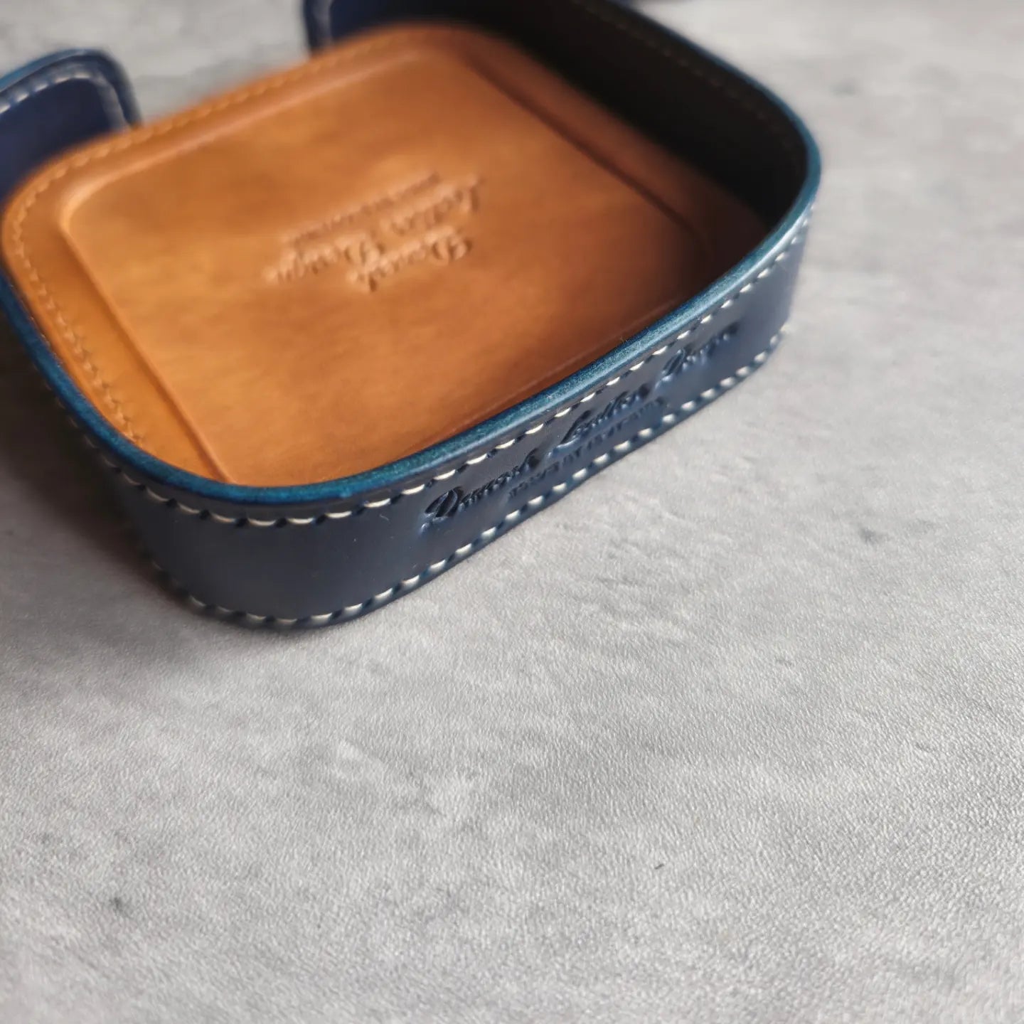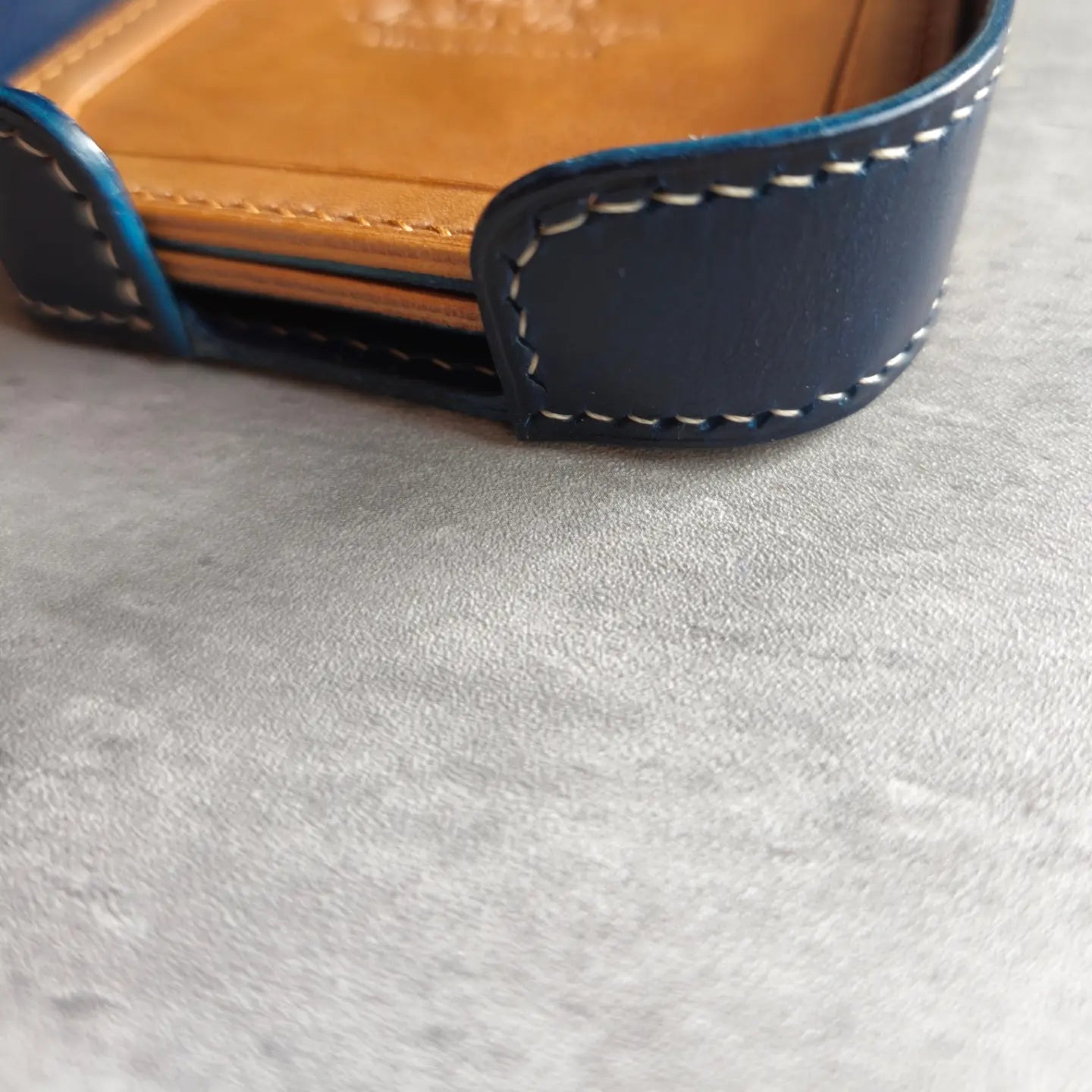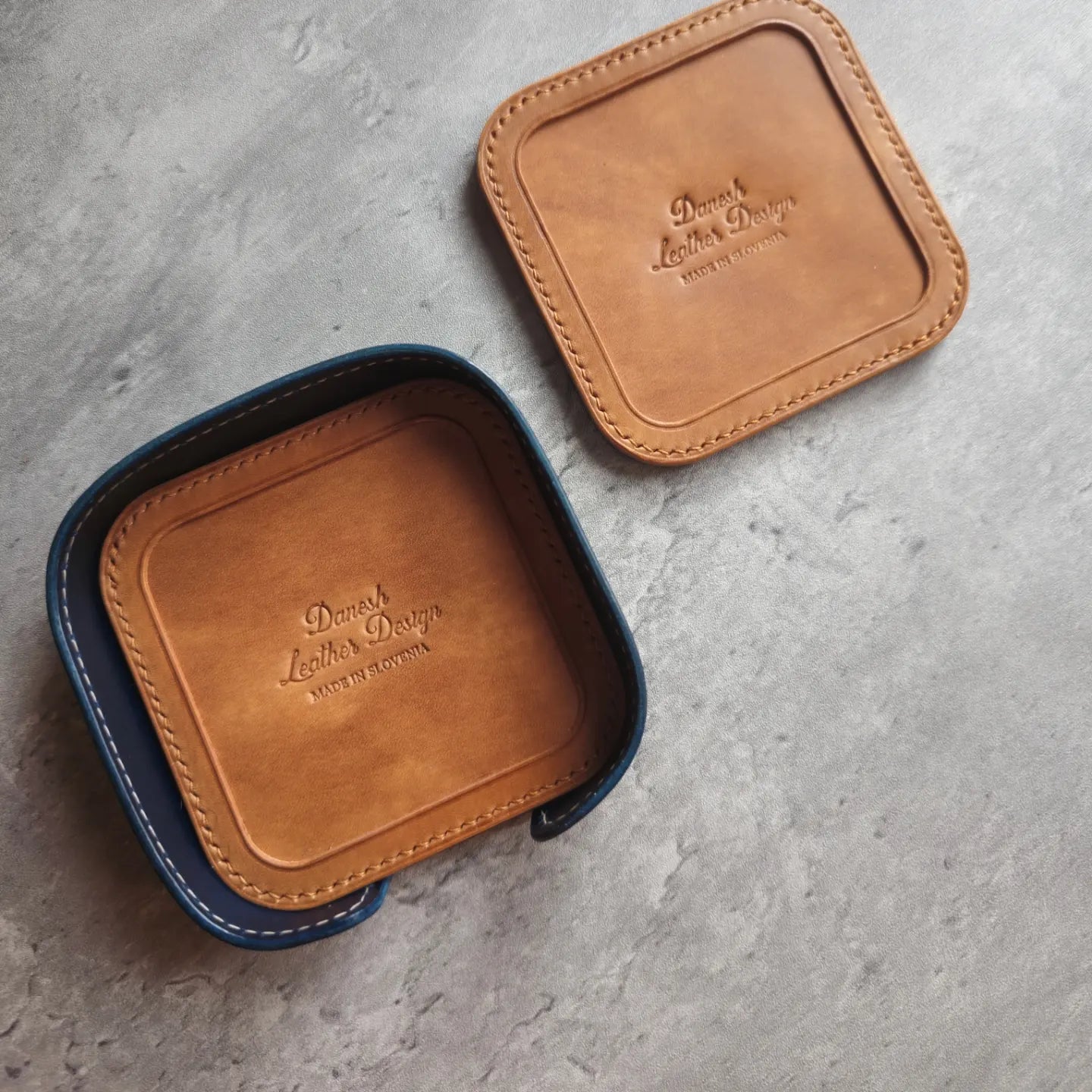 The coasters are 9x9cm with a tin around the edges to prevent from drinks to turn over. The bottom is a third layer which I recommend using something rough or at even embossed leather to prevent sliding.