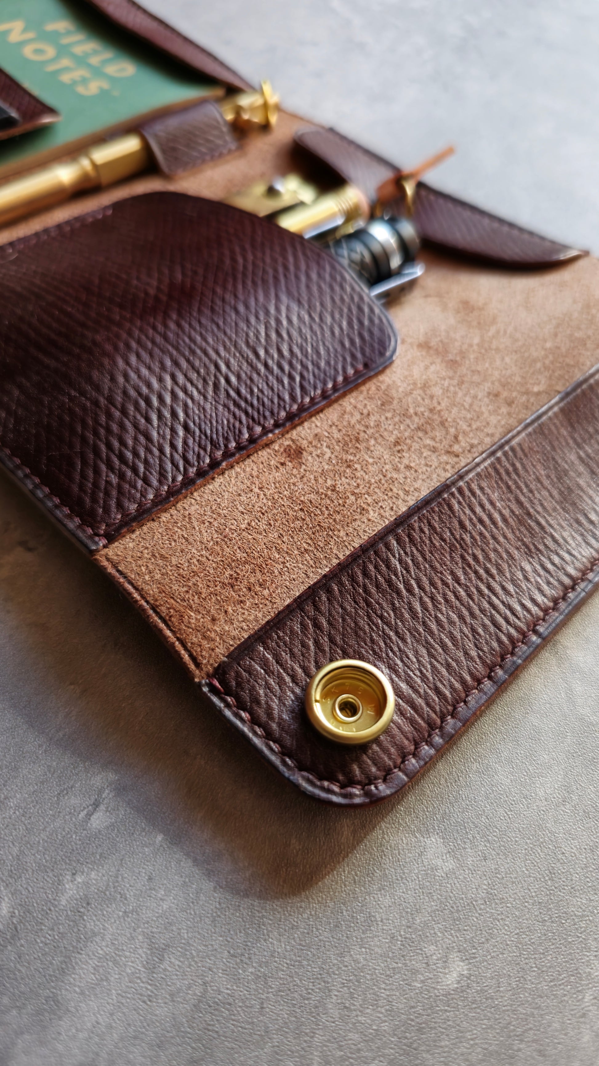 Leather - medium to hard tempered at 1.0-1.6mm. I recommend using thicker leather for the outer shell and around 1.2mm for the inner parts. In general softer and it thinner leather would allow more space in the pockets.