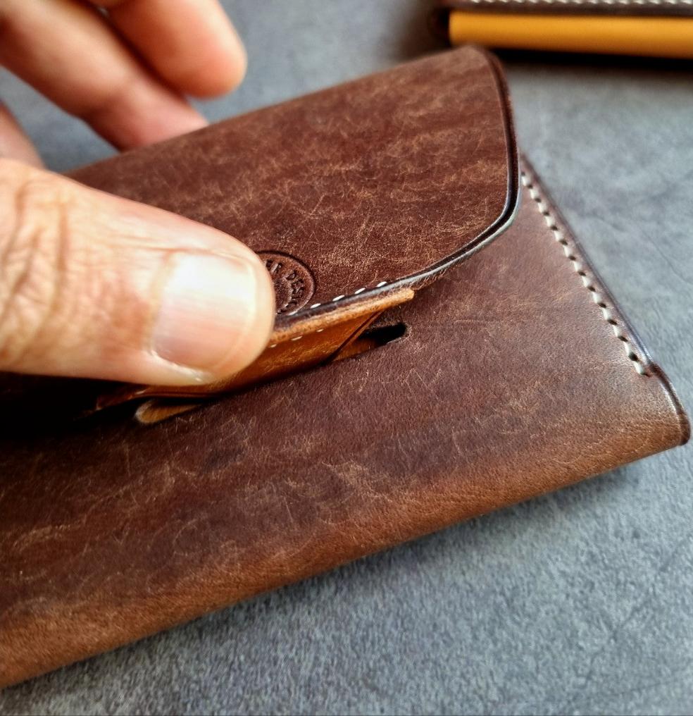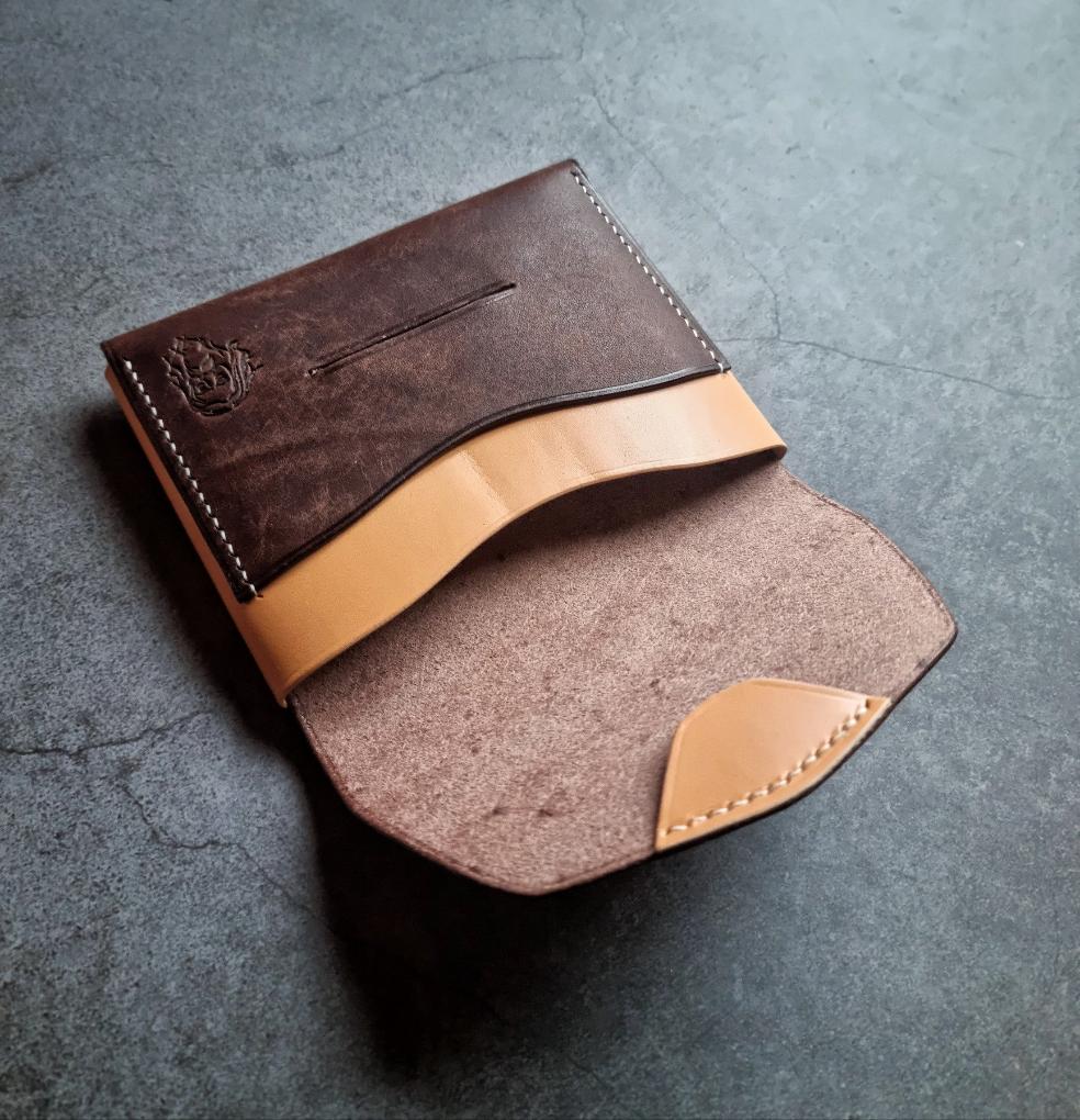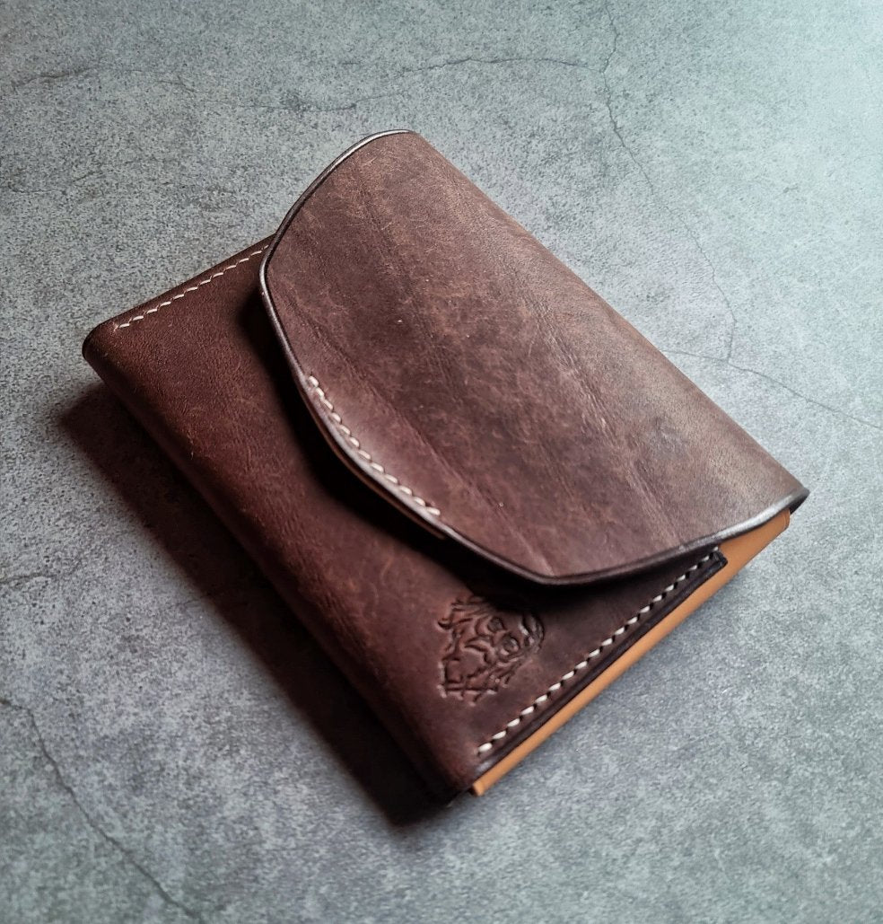 The Jeanned’Arc is a wide flap wallet with a few design features, which are practical and minimalsitic: The flap itself features a no hardware closure and the back pocket which is corset stitched, locket in place with an insert piece.
